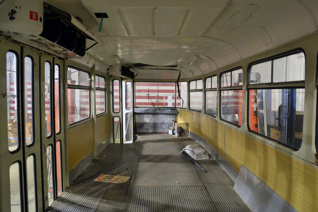 interiér měřícího vozu během odstrojování, chybí zejména vyvýšená sedadla a kopule pro pozorování troleje