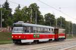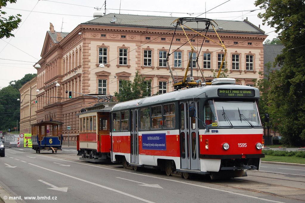 souprava 1595+10 připravena zasáhnout do průvodu vozidel po odpojení vlečného vozu koňky při oslavách 140 let MHD v Brně