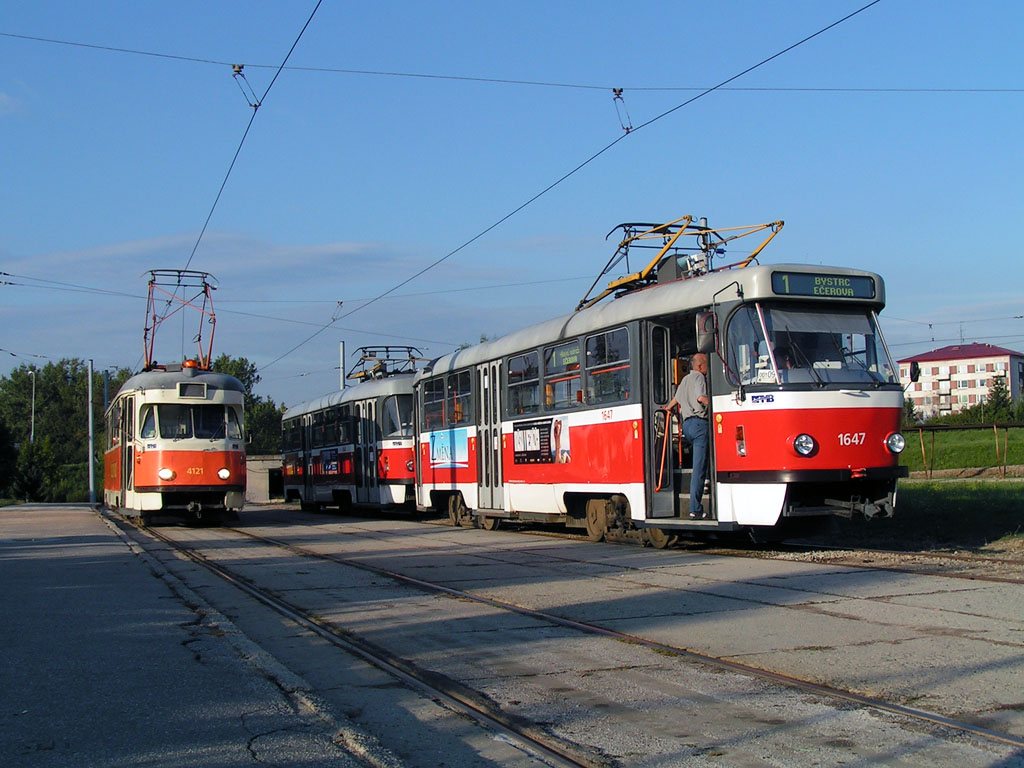 Fotografie ČKD Tatra T3G 1647 DPMB | ČKD Tatra T3G 1648 DPMB | Tatra T2 služební 4121 DPMB | Brno-Bystrc | Fotogalerie BMHD