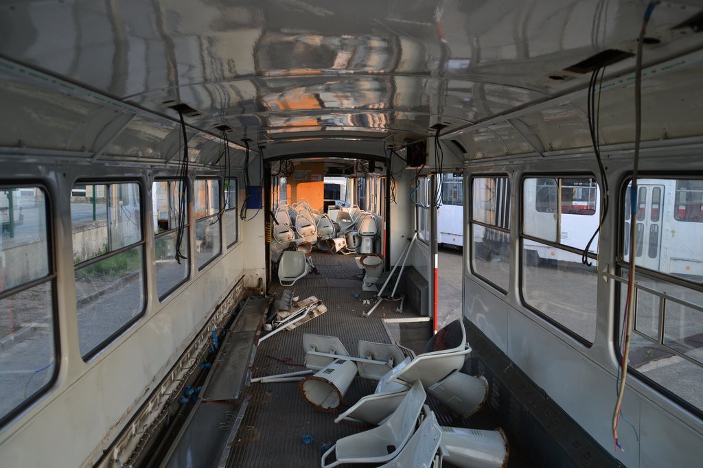 interiér rozebraného vozu K2 1112 čekajícího na šrotaci