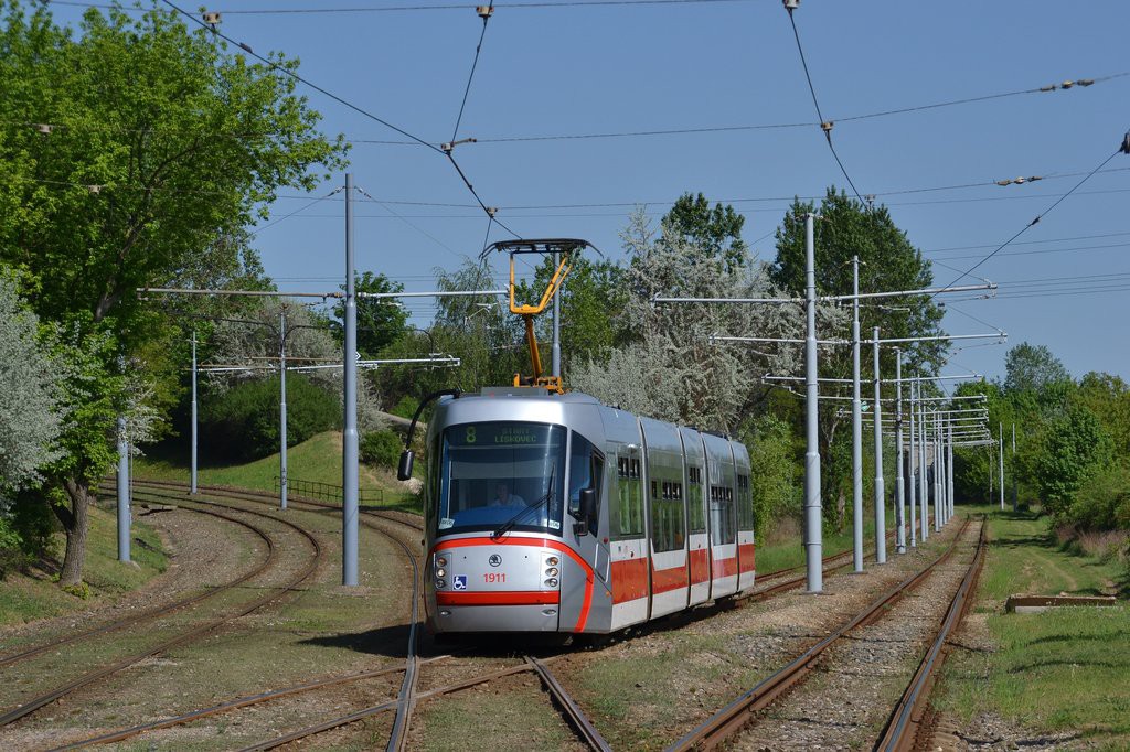 Při výluce tramvají do Líšně v sobotu 8.5.2012 byla linka 8 ukončena na Stránské skále a bylo možné nasazení jednosměrných vozidel.