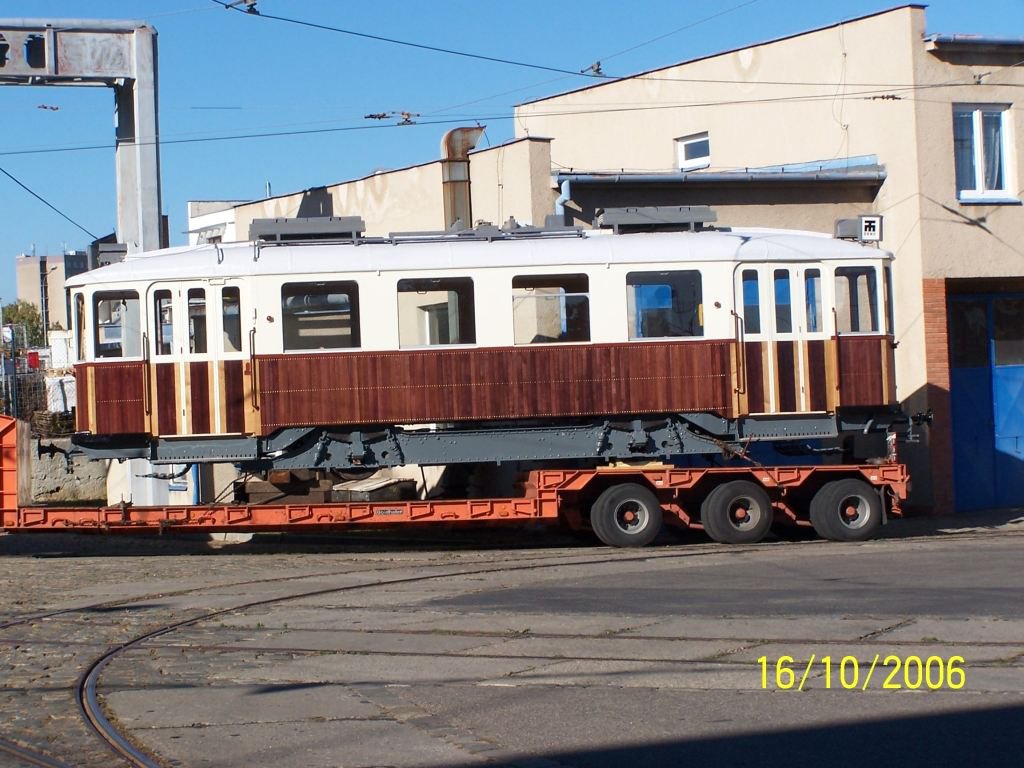 Historický vůz 99 na trajleru krátce po příjezdu z rekonstrukce v KOS Krnov.
