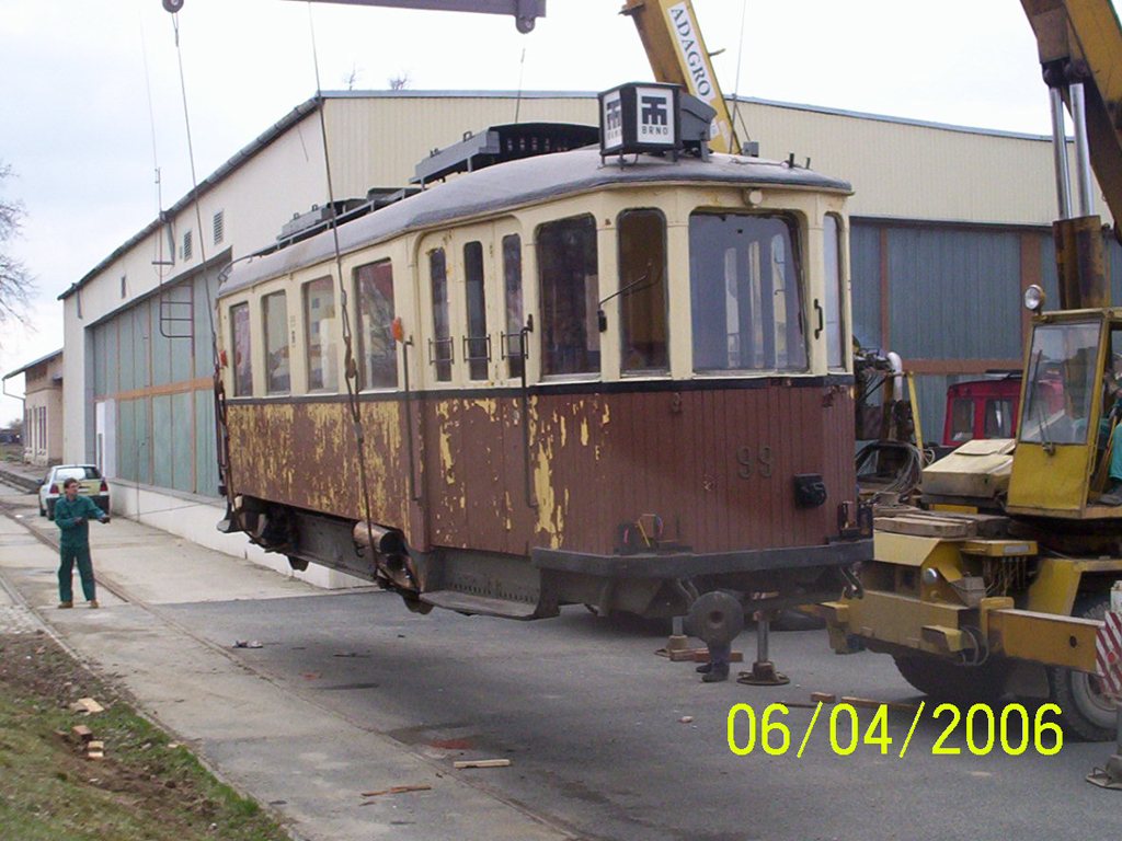 Historická tramvaj 99 při nákládce na trajler do KOS Krnov