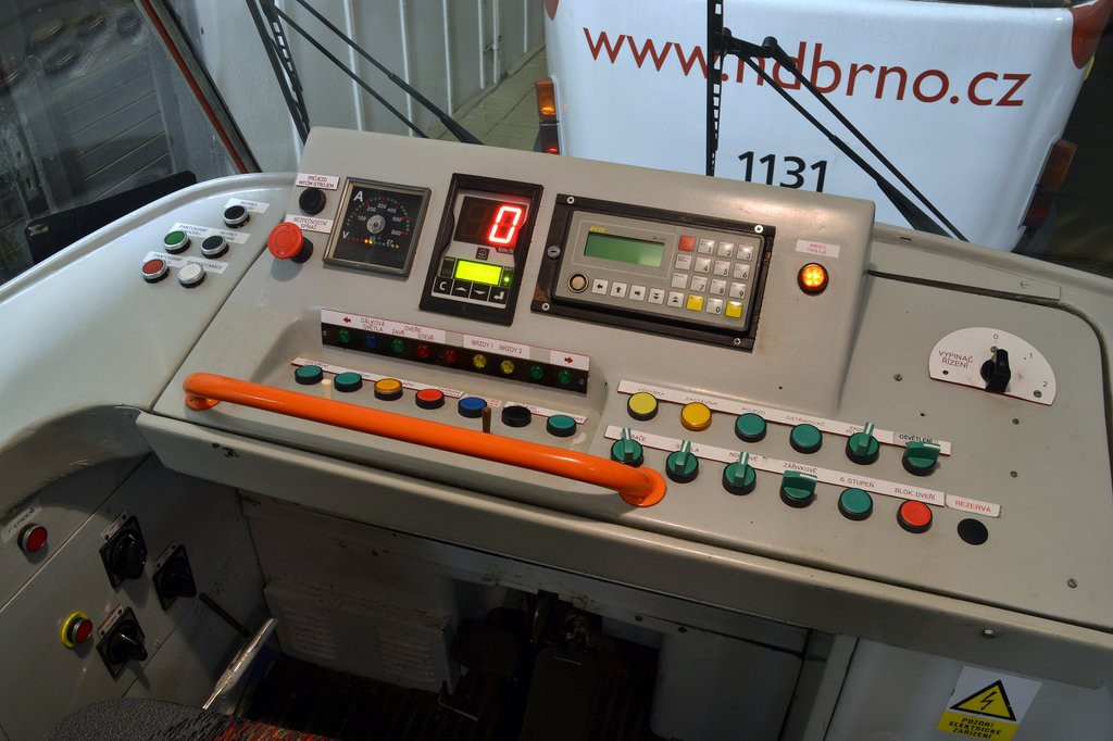 palubní deska vozu K2 1127, která se mírně odlišovala od ostatních K2 rozvržením ovladačů (např. dvě řady tlačítek v pravé části atd.). V levé části panelu jsou patrné ovladače elektrického stahováku pantografu.