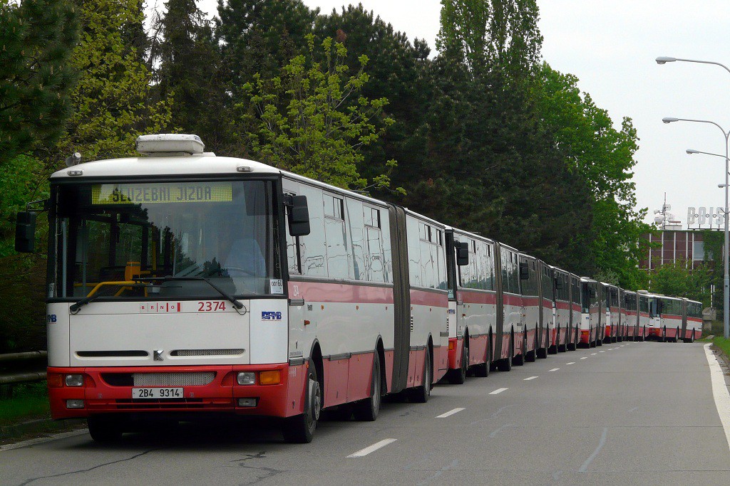 Kloubové autobusy připravené na operativní výjezd během prvomájového pochodu 2011