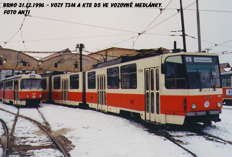 Fotografie ČKD Tatra KT8D5SU 1728 DPMB | ČKD Tatra T3M 1584 DPMB | Brno-Medlánky, vozovna Medlánky | Fotogalerie BMHD
