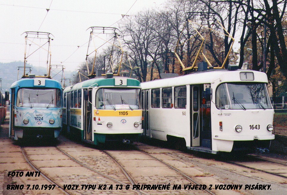 Fotografie ČKD Tatra K2 1024/II DPMB | ČKD Tatra K2 1105/II DPMB | ČKD Tatra T3G 1643 DPMB | Brno-Pisárky, Vozovna Pisárky | Fotogalerie BMHD